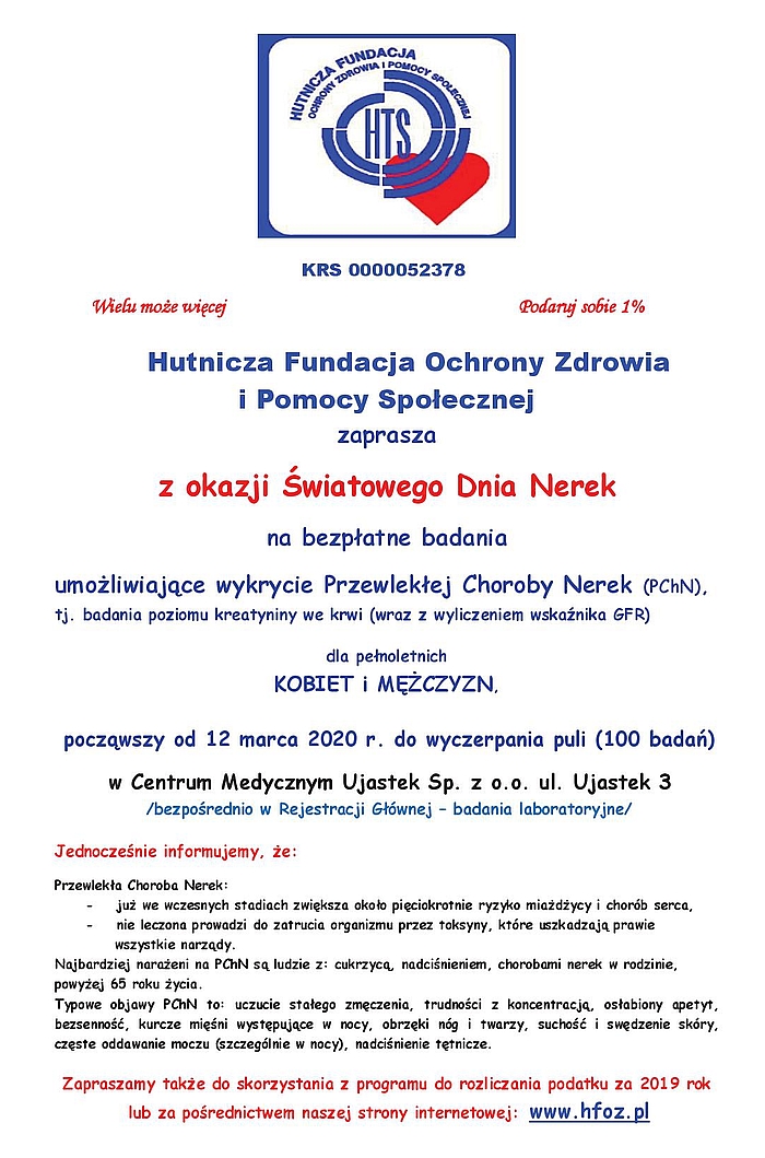 Uprzejmie zapraszamy w imieniu naszej Fundacji HFOZ i PS na bezpłatne badania poziomu kreatyniny we krwi (wraz z wyliczeniem wskaźnika GFR) dla pełnoletnich kobiet i mężczyzn.